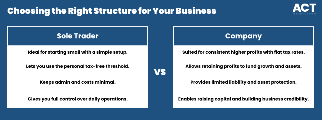 A company structure can be the better choice when you expect consistent higher profits and want to benefit from a flat company tax rate. This structure becomes particularly valuable when you plan to retain profits within the business to fund growth, build reserves, or acquire business assets. Companies also provide limited liability protection, which helps separate business risks from personal assets. If you need to raise capital, bring in co-owners, or build credibility with larger clients and lenders, a company structure often opens doors that might remain closed to sole traders.