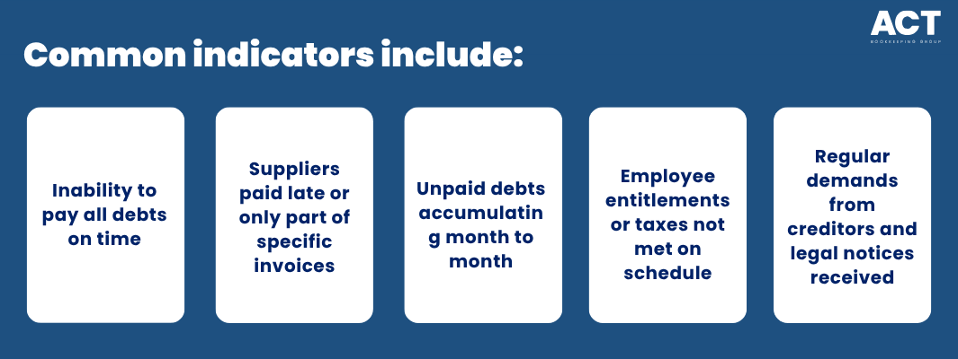 It’s vital for company directors to watch out for financial difficulties before they become a crisis. Warning signs that a company is insolvent include not only missed creditor payments but also a decline in the company’s assets against its liabilities.