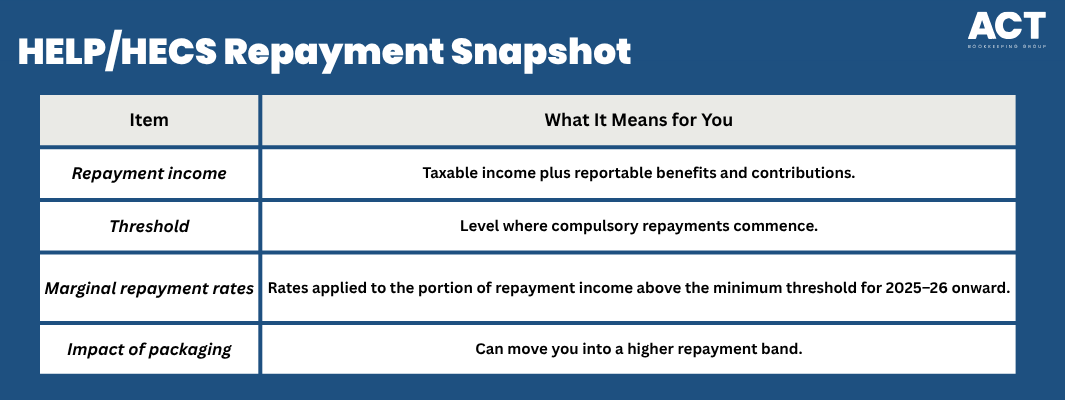 If you have a HELP or HECS balance, it is important to understand how a salary sacrifice arrangement will affect both take-home pay and your student loan. Packaging certain expenses can bring less tax and more home pay but may also push your repayment income above the threshold. You need to decide whether that trade still feels right once you factor in the higher compulsory repayment.