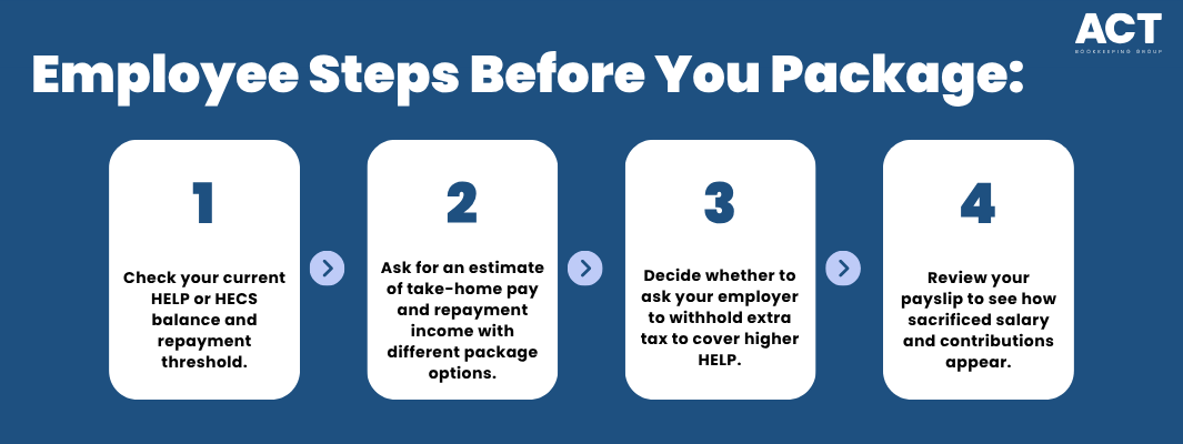 Employers must make sure PAYG withholding and reporting match each employee’s tax and HELP situation. If you help staff commence salary packaging without understanding their HELP or HECS status, you may withhold less tax than needed. This can damage trust when employees receive unexpected tax and HELP bills.