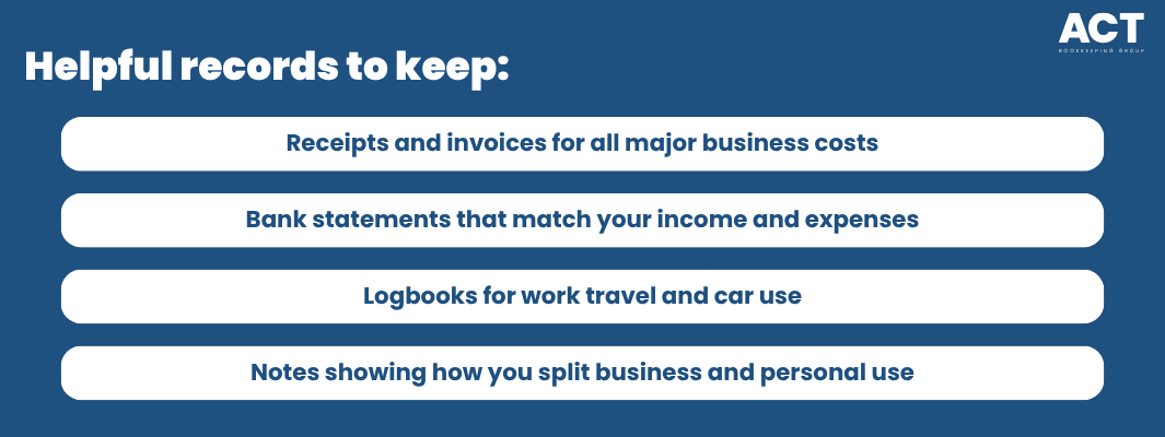 To claim tax deductions with confidence, you must keep good records throughout the financial year. This usually includes receipts, invoices, bank statements, and any logbooks or diaries that show how you worked out the business portion of an expense. A bank statement alone is often not enough. You should also keep invoices, receipts, logbooks, and notes showing the business purpose and any private apportionment.
